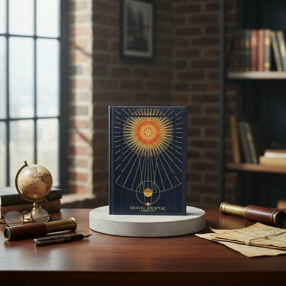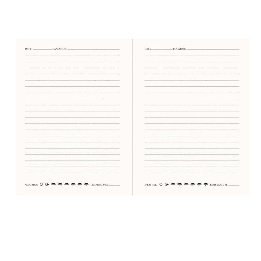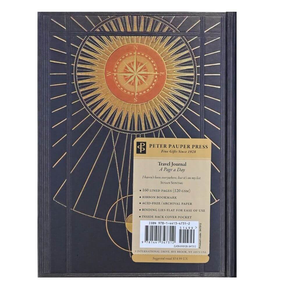 Elegancki dwustronny notatnik dziennik marki Peter Pauper Press – Dziennik Podróży (Travel Journal). Dziennik podróży ze specjalnymi miejscami na wpisanie dat, lokalizacji oraz piktogramami służącymi do zaznaczenia aktualnej pogody. Notatnik posiada okładkę zdobioną opalizującymi elementami i tłoczeniami oraz złocone brzegi stron.