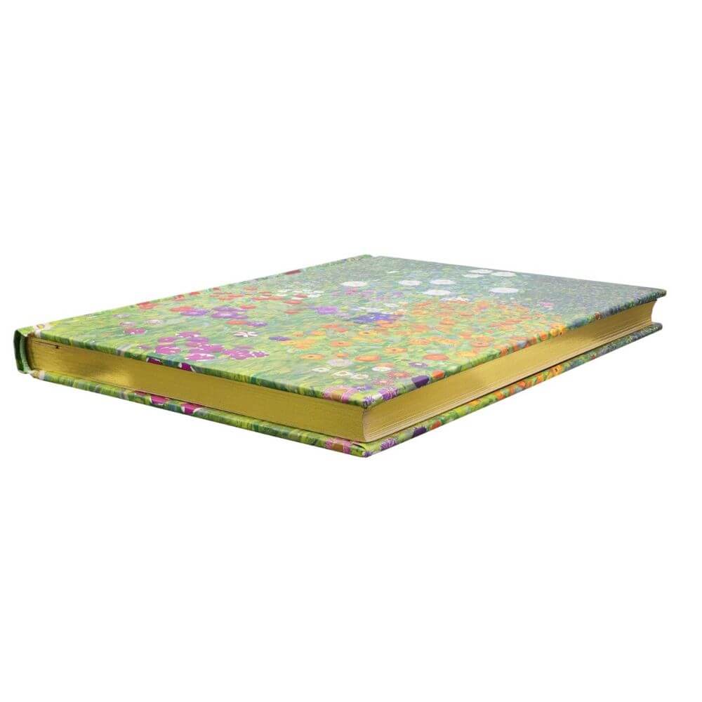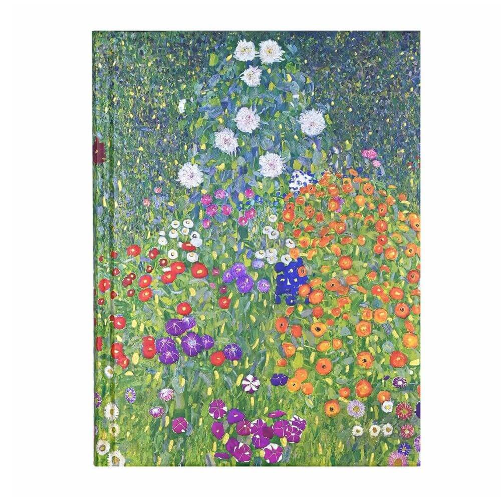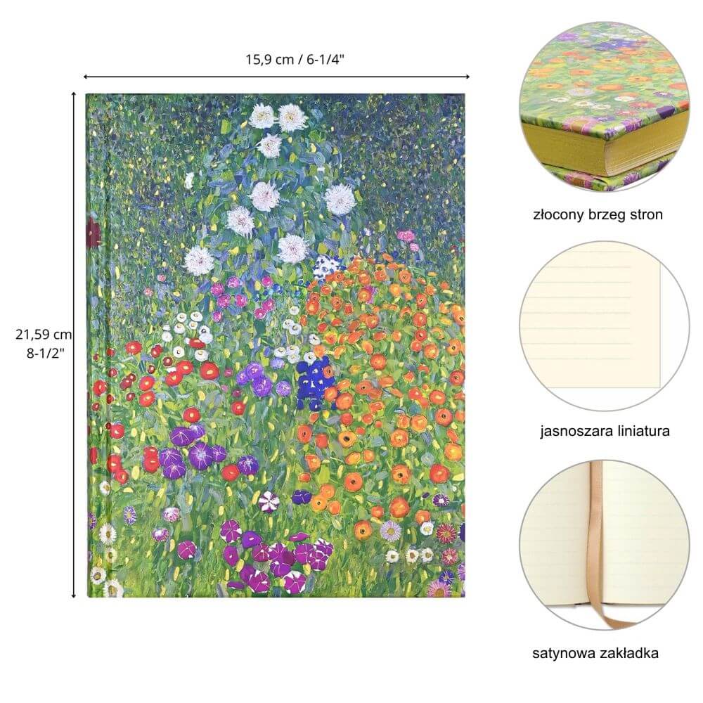 Zeszyt w twardej oprawie - Ogród Kwiatowy (Cottage Garden), idealny jako pamiętnik, bullet journal, szkicownik itp. Inspirację dla okładki stanowi obraz Gustava Klimta, namalowany w 1907 roku. Notatnik posiada okładkę zdobioną elementami pokrytymi złotą folią i tłoczeniami oraz złocone brzegi stron.