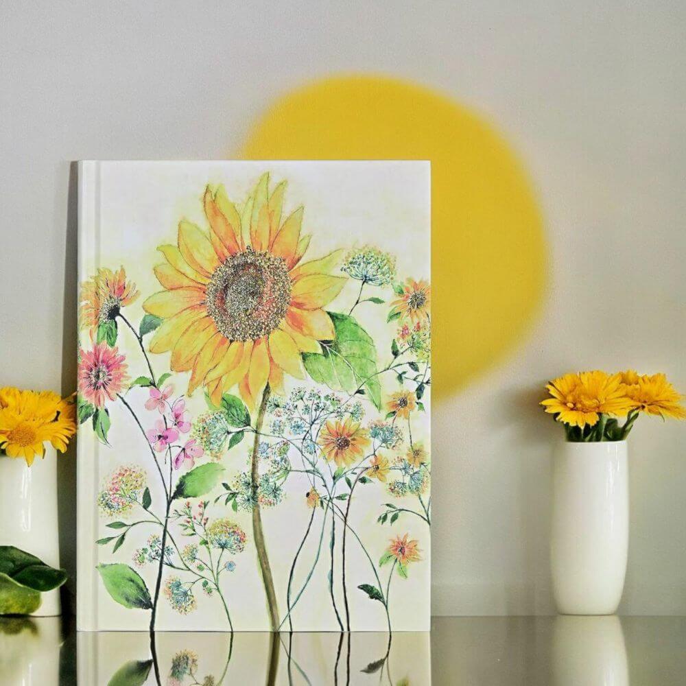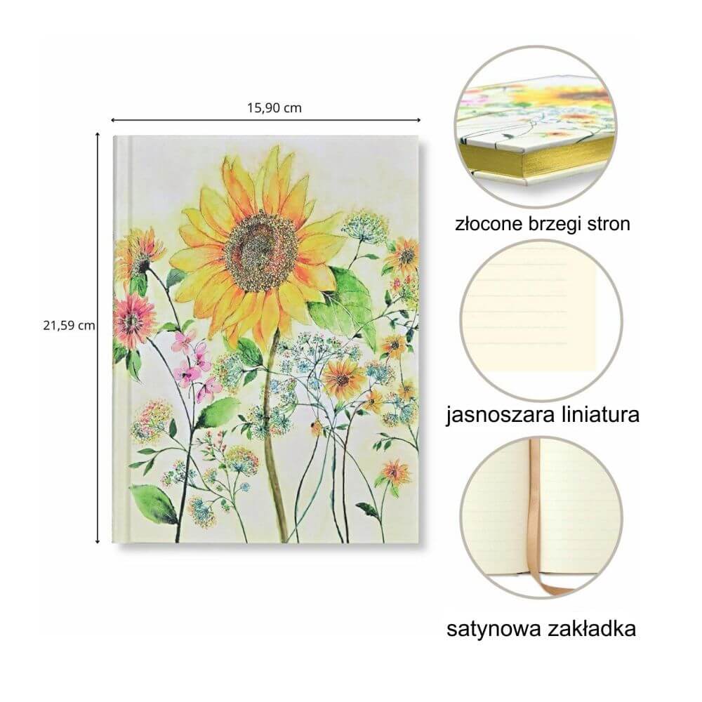 Zeszyt w twardej oprawie, idealny jako pamiętnik, bullet journal, szkicownik itp. Papier bezkwasowy. Elegancki notatnik – Słonecznik Akwarela (Watercolor Sunflower), okładka przedstawia kwiaty słonecznika w akwarelowej stylistyce.