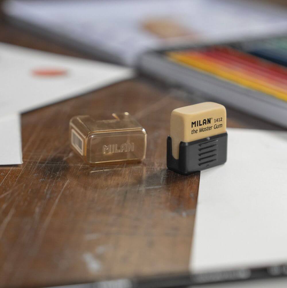 Gumka "chlebowa" Master Gum do sztuk pięknych w twardym ochronnym etui. Wykonana z syntetycznej gumy, ma silne właściwości adsorpcyjne: łatwo się ściera, bez konieczności mocnego naciskania na powierzchnię papieru,tworząc gładki pył gumki. Może być używana do ścierania grafitu lub rozmazywania śladów wykonanych węglem drzewnym, a także do renowacji i czyszczenia dokumentów.