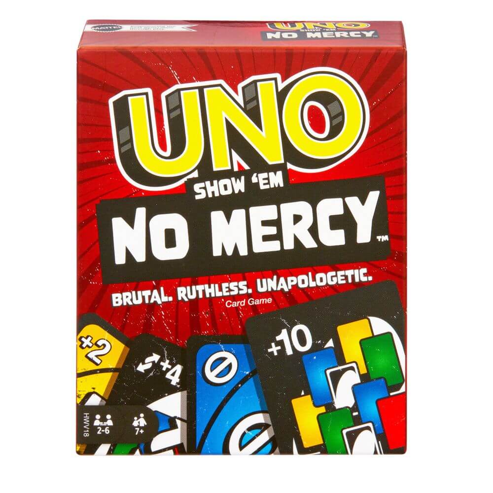 UNO No Mercy Bez litości to najbardziej bezwzględna wersja UNO! Ma o wiele więcej kart (56 dodatkowych) i DUŻO surowsze kary (dobieranie 10 kart to wyzwanie!), a do tego nowe reguły, przez które gracze będą dokładać, wymieniać i dobierać więcej kart niż kiedykolwiek wcześniej. Jest tu nawet reguła „Litości” , jeśli sprawy zabrną za daleko.