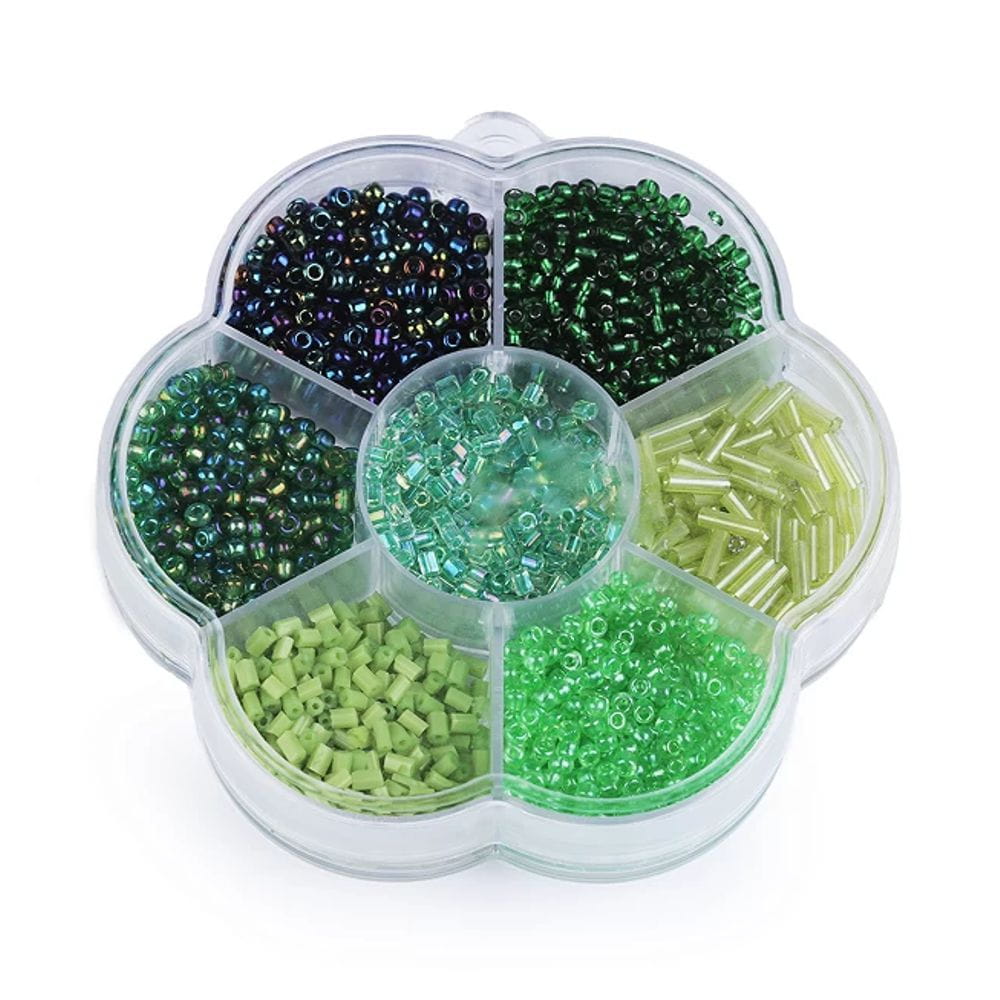Plastikowe pudełko w kształcie kwiatka zawiera kolorową mieszankę koralików w zielonym miksie kolorystycznym. Koraliki można naklejać np. na papierowe kartki okolicznościowe, zaproszenia, ramki na zdjęcia itp. Zestawy świetnie nadają się do robienia biżuterii, naszyjników, bransoletek, haftu koralikowego.