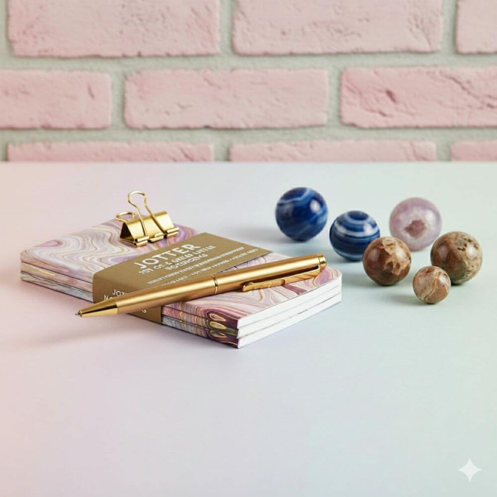 Zestaw trzech szytych notesów z serii Jotter marki Peter Pauper Press. W skład zestawu wchodzą 3 notesiki w kieszonkowym rozmiarze, każdy z okładką przedstawiającą ten sam motyw, ale w innej kolorystyce.