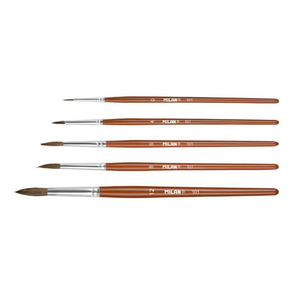 Zestaw okrągłych pędzli z krótką drewnianą rączką, lakierowaną na brązowo i aluminiową skuwką. Odpowiedni do akwareli, technik wodnych i gwaszu. Numery 0, 4, 6, 8 i 12. Seria 101.