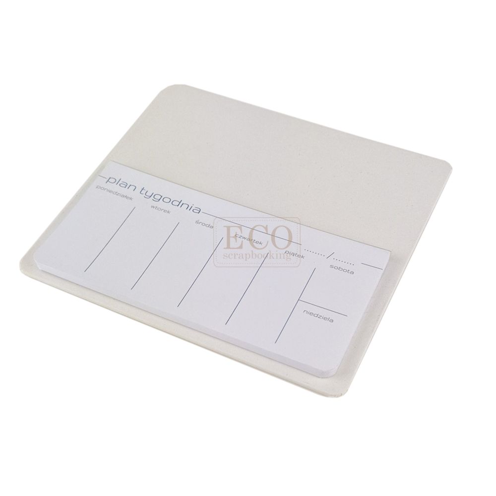 Notes z magnesem na lodówkę - oklejony płótnem introligatorskim. Sama baza wyonana jest z tektury 3mm, oklejona płótnem białym, na rewersie przyklejony jest magnes, do bazy dołączony jest bloczek z planerem tygodniowym