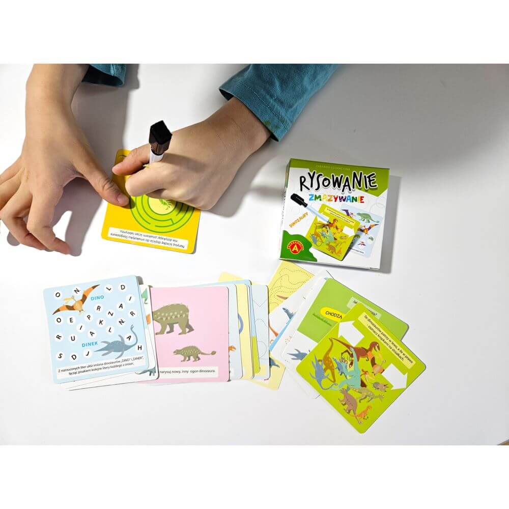 „Rysowanie Zmazywanie – Dinozaury” to zestaw 17 dwustronnych kart (34 plansz), na których znajdują się zadania na spostrzegawczość, myślenie, wyobraźnię i ćwiczenie zręczności manualnej. W zestawie znajduje się również ścieralny pisak, dzięki niemu gra jest wielokrotnego użytku.